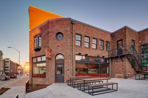 This corner semi-attached building with small front parking lot was vacated after the long-time owner-occupant retired, leaving 8,347 square feet of commercial space available within the East Village neighborhood of Des Moines. The rehabilitation process revealed and re-established historic finishes and features. The new floor plans honor historic uses and divisions of space: The retail storefront returned to retail use with the existing partial basement (tire/battery storage area) ramped down to accessible restrooms; the front paved area (gas pumps) serves as a patio with food truck parking and a walk-in cooler (gas attendant stand). The upper-level apartment (office) was retained and reconfigured, with access through the existing exterior stair. The rear multi-use service station was subdivided into three tenant spaces using existing pilasters, trusses, and masonry walls to locate demising walls; a shared restroom is located within the original car wash bay. Existing windows and doorways were re-opened, and two new doorways were inserted into existing window openings. Work included: removal of cover-up materials, plaster repair, window rehab, new custom windows to re-establish missing/damaged historic wood windows based on historic photos (arched door transom, office oriel window, and divided-lite office windows), concrete floor repair, steel truss-work cleaning, roofing, and site work. Photographer: Cameron Campbell