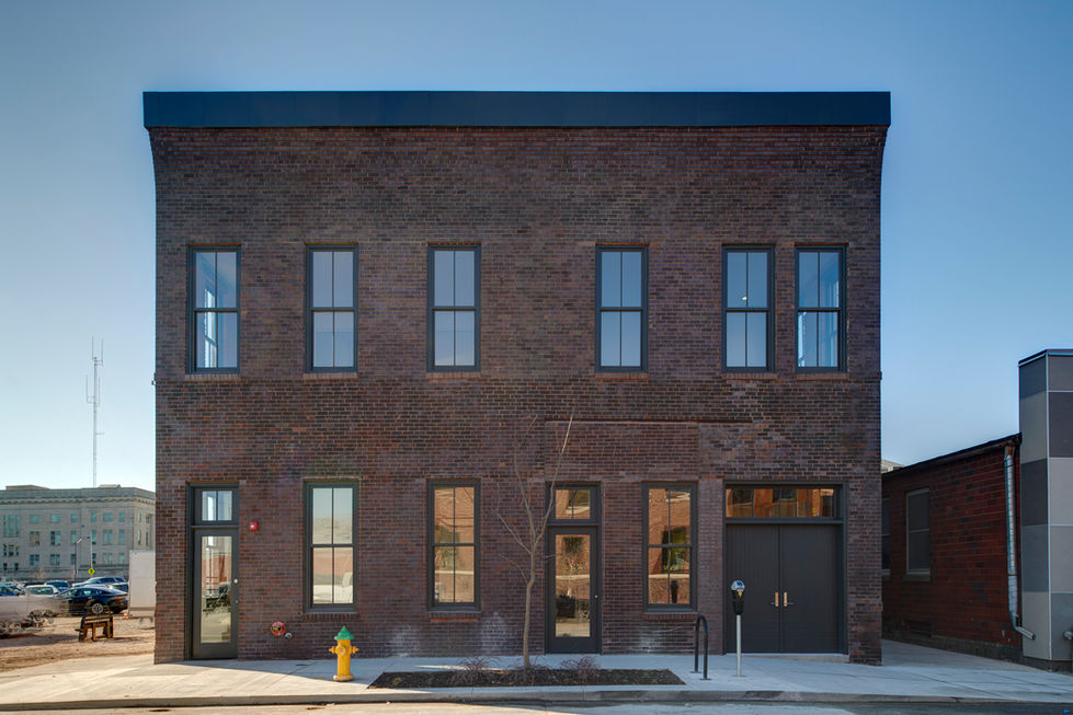 The architectural effort was to retain the historic building envelope as well as its original window and carriage door openings. All modern CMU window infill and garage doors were removed and replaced with new recessed mahogany wood storefronts, pedestrian doors, and non-operable carriage doors. New 2/2 wood double-hung windows were installed throughout with thermally broken, wood-frame windows to replicate the original windows per photographic evidence sourced from the Des Moines Register and other vintage imagery from the area.