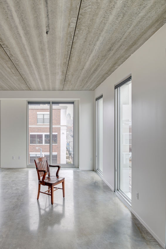 Located in 350 East Locust in Des Moines’ East Village, this new mixed use housing facility designed by Peter P. Goché (Goché inclusions llc) and executed by Neumann Monson Architects. Conceived of as a machined mass of clay and steel (Corten), the building block re-establishes the historic street wall and thus restores the socio-political engagement of urban life. Within, a serial set of spatial configurations provides a range of affordable housing, ground level retail and a penthouse office suite – each replete with a cultural aperture whereby one might be seen or unseen as a dimension of the public. Completed date: 2014, Project Owner: Tim Rypma, Contractor: Graham Construction, Photographer: Cameron Campbell